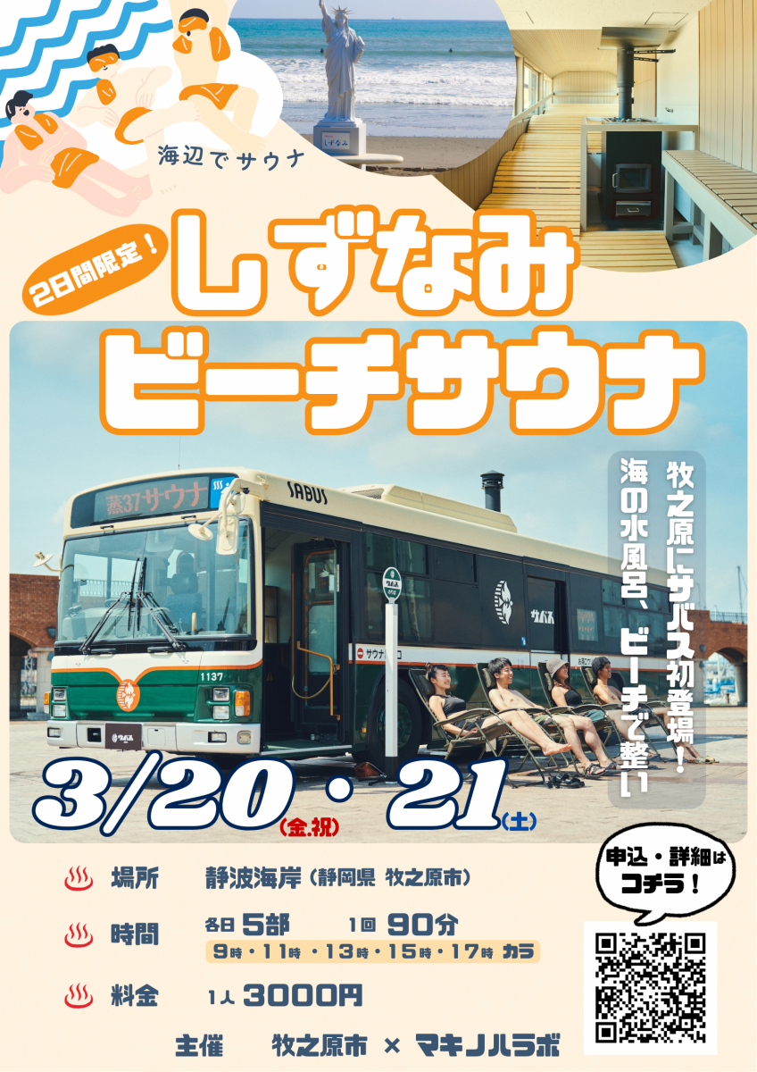 路線バスを改造した移動式本格サウナバス「サバス」が、牧之原・静波海岸に初登場します!